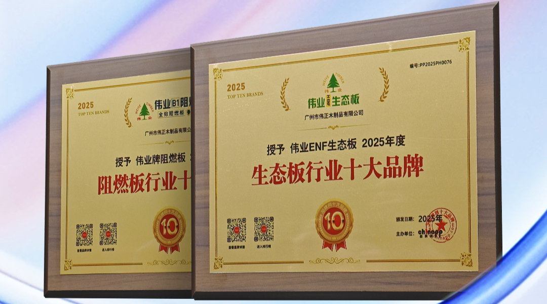 近日,偉業牌以 “雙冠王” 之姿震撼登場!在品牌網權威發布的 2025 年度生態板十大品牌與阻燃板十大品牌榜單中,偉業牌憑借突破性環保技術與行業領先阻燃工藝,強...
