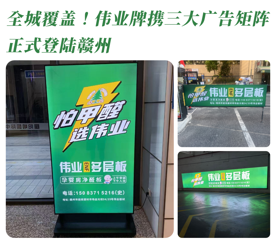 針對贛州家居消費(fèi)市場,偉業(yè)牌板材再出重拳——攜道閘廣告、LED廣告機(jī)、地庫燈箱三大廣告矩陣,已正式登陸贛州! 作為華南板材行業(yè)領(lǐng)軍品牌,偉業(yè)牌板材始終以硬核品質(zhì)...